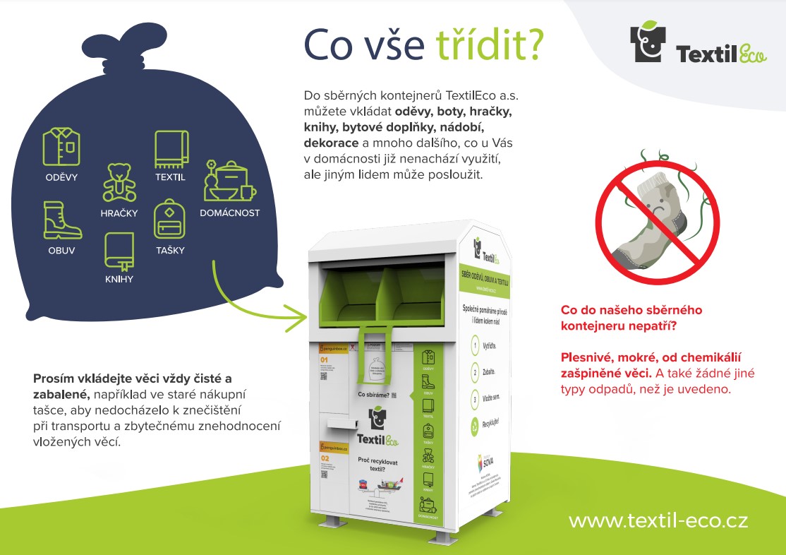 Prosíme, abyste využili pro třídění naše kontejnery umístěné v obci nebo můžete použitelný textil věnovat přímo nějaké charitativní organizaci.