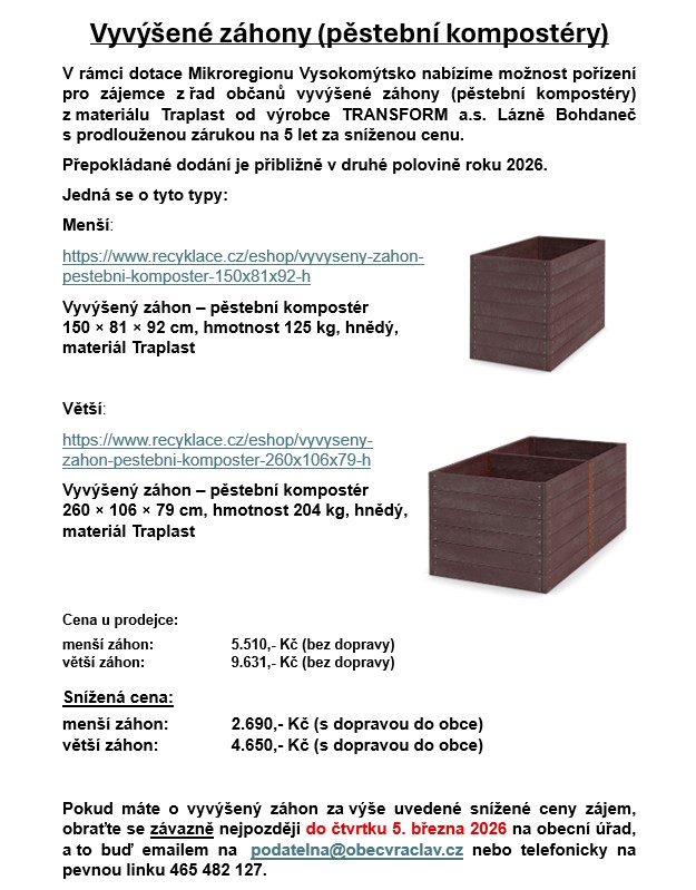Pokud máte o vyvýšený záhon za výše uvedené snížené ceny zájem, obraťte se závazně nejpozději do čtvrtku 5. března 2026 na obecní úřad,